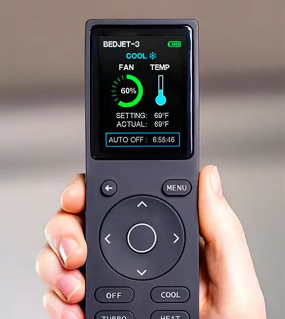 Control your temperature by degree, adjust air flow settings, auto-shutoff times and program biorhythm sleep temperatures all with real time feedback from the color screen. For dual-zone systems, now both sides of the bed can be controlled from a single remote. Backlit keys mean no fumbling around in the dark for late night adjustments and updateable firmware means your BedJet 3 will never become obsolete.