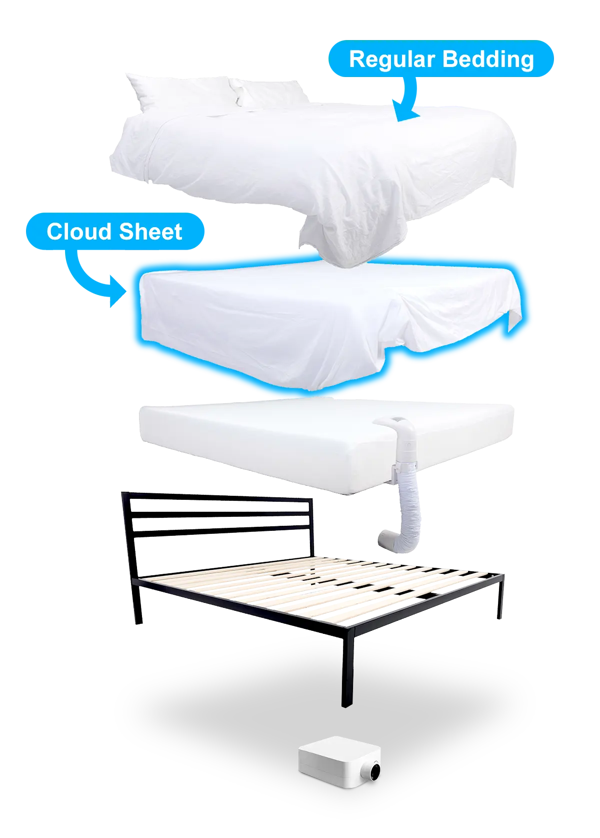 The BedJet system works with your existing bedding. For the very best cooling performance, add a Cloud Sheet (sold separately)! The BedJet air nozzle connects right to the Cloud Sheet, enabling the most even distribution of air in the bed.